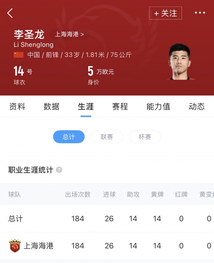 李圣龙现年33岁,代表海港一线队共出场184次,打进26球送出14次助攻。